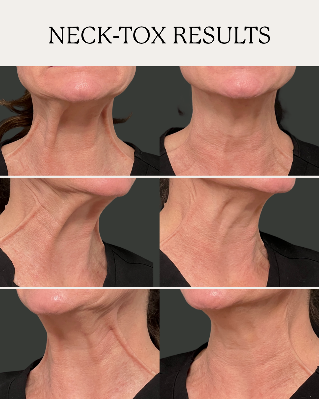 Neck-Tox targets the platysma bands—the vertical muscles that can cause the banding in the neck. A few small Botox injections in this area help smooth the neck, soften banding, and create a more youthful appearance. It’s the perfect complement to your facial Botox treatment!
